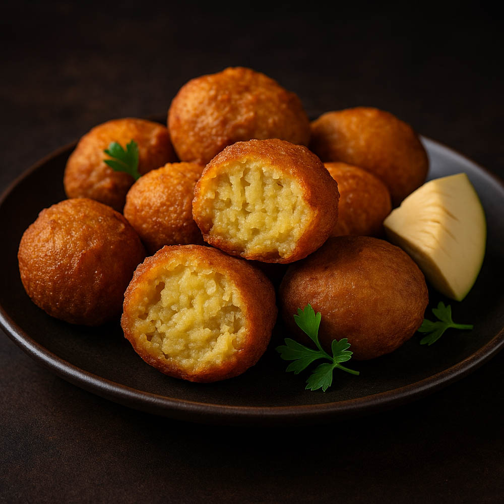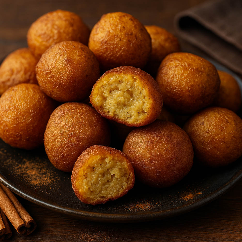 Beignet moelleux sucré-salé à base de banane plantain mûre, relevé d’une pointe de cannelle et de muscade.